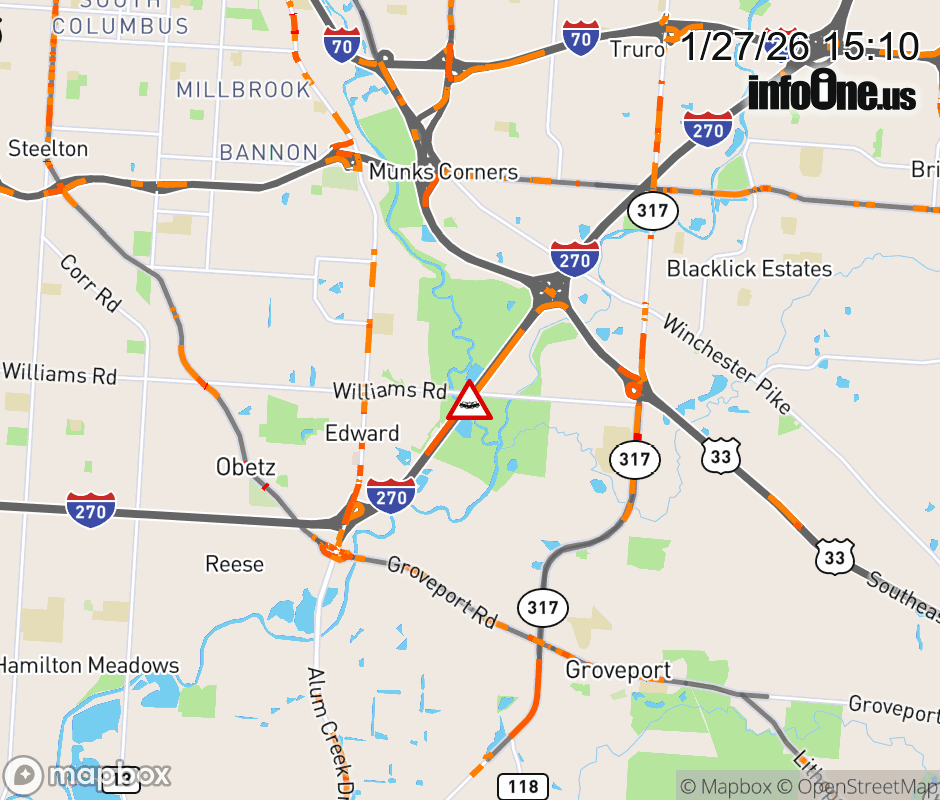 The left lane is blocked on I-270 North beyond Alum Creek Dr, due to a crash. Updated: Tue 1/27/26 3:10 PM EST ![]() Updated: Tue 1/27/26 3:10 PM EST |
