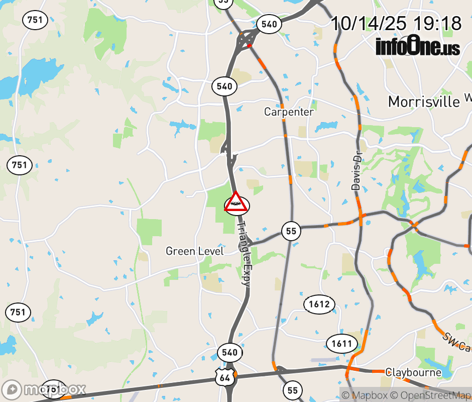 The right shoulder has reopened 1 mile before Exit 62 (Green Level Rd). Updated: Tue 10/14/25 7:18 PM EDT ![]() Updated: Tue 10/14/25 7:18 PM EDT |