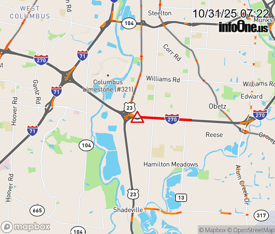 The left lane is blocked on I-270 West at US-23/S High St North, due to a crash. Updated: Fri 10/31/25 7:22 AM EDT ![]() Updated: Fri 10/31/25 7:22 AM EDT |