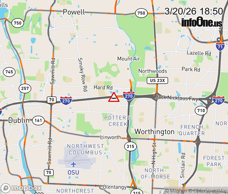 The right lane is blocked on I-270 East at SR-315, due to a crash. Updated: Fri 3/20/26 6:50 PM EDT ![]() Updated: Fri 3/20/26 6:50 PM EDT |