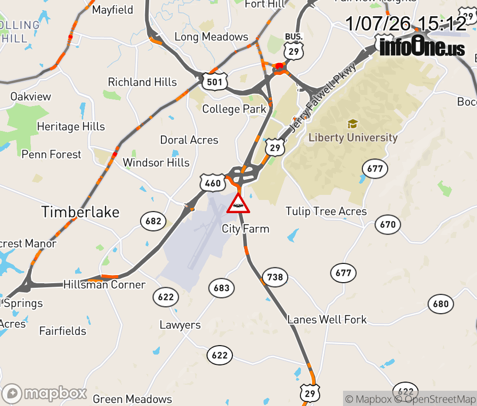 On US-29 South in the County of Campbell, in the vicinity of Airport Cir, motorists can expect delays due to a vehicle crash. Lane closures exist. ![]() |