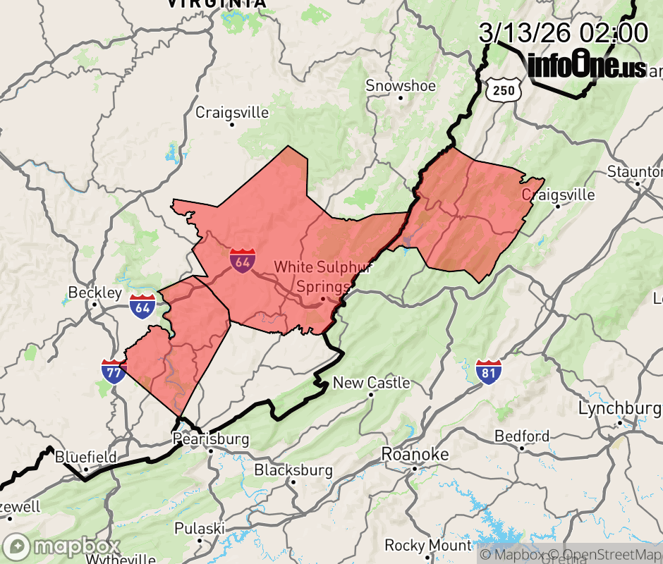 Canceled 3/13/26 11:10 AM Wind Advisory issued March 13 at 1:59AM EDT until March 13 at 8:00PM EDT by NWS Blacksburg VA * WHAT... Southwest winds 15 to 25 mph with gusts up to 45 mph expected. * WHERE... In Virginia, Bath County. In West Virginia, Eastern Greenbrier, Summers, and Western Greenbrier Counties. * WHEN... From 8 AM this morning to 8 PM EDT this evening. * IMPACTS... Gusty winds will blow around unsecured objects. Tree limbs could be blown down and a few power outages may result. ![]() |