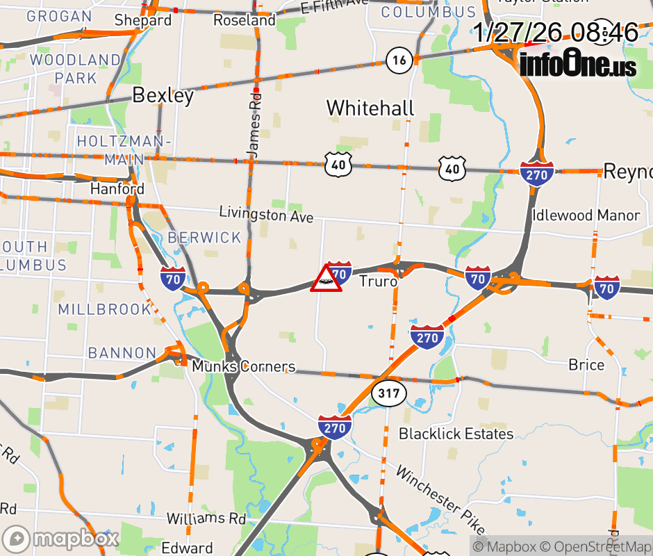 The left lane is blocked on I-70 West beyond SR-317/Hamilton Rd, due to a crash. ![]() |