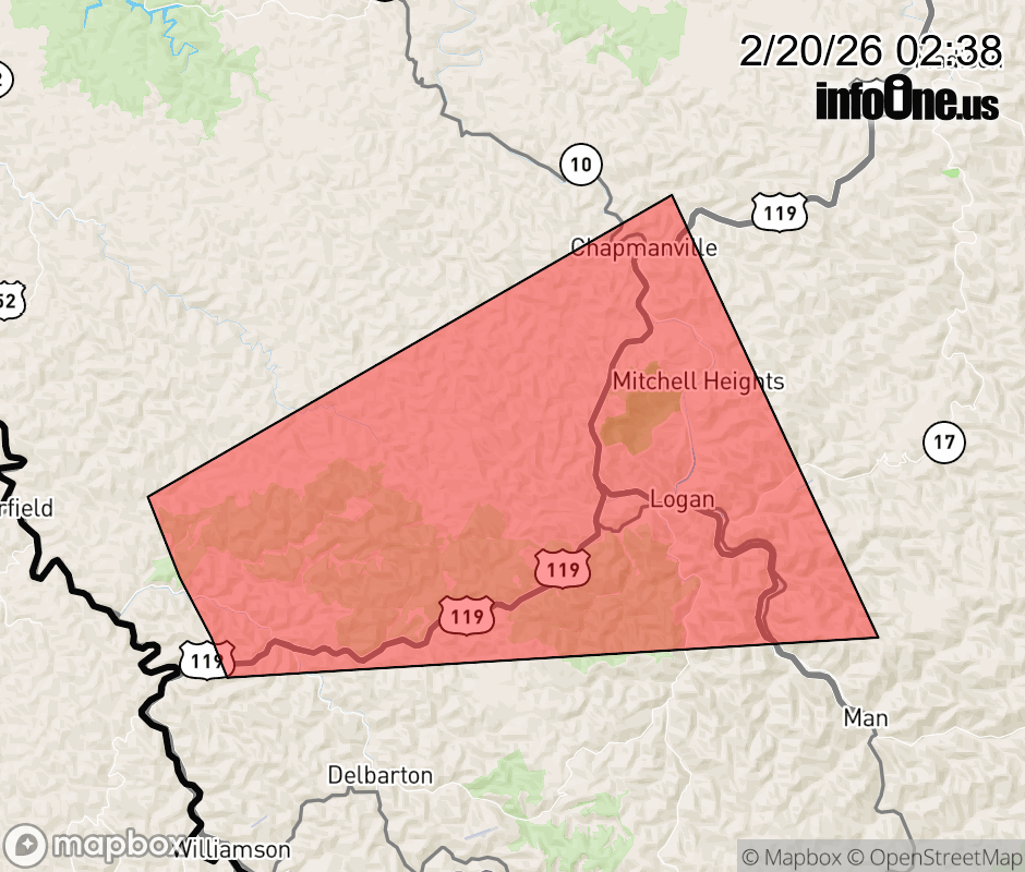Canceled 2/20/26 2:45 AM Severe Thunderstorm Warning issued February 20 at 2:37AM EST until February 20 at 2:45AM EST by NWS Charleston WV At 236 AM EST, a severe thunderstorm was located over Holden, or near Logan, moving east at 50 mph. HAZARD...60 mph wind gusts and quarter size hail. SOURCE...Radar indicated. IMPACT...Hail damage to vehicles is expected. Expect wind damage to roofs, siding, and trees. Locations impacted include... Logan, Chapmanville, Holden, Chief Logan State Park, Mount Gay-Shamrock, West Logan, Mitchell Heights, Mount Gay, Verdunville, Myrtle, Switzer, Dingess, and Lenore. ![]() |