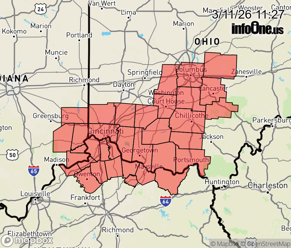 Canceled 3/11/26 12:00 PM Tornado Watch issued March 11 at 11:26AM EDT until March 11 at 12:00PM EDT by NWS Wilmington OH TORNADO WATCH 41 REMAINS VALID UNTIL NOON EDT TODAY FOR THE FOLLOWING AREAS IN INDIANA THIS WATCH INCLUDES 5 COUNTIES IN SOUTHEAST INDIANA DEARBORN FRANKLIN OHIO RIPLEY SWITZERLAND IN KENTUCKY THIS WATCH INCLUDES 12 COUNTIES IN NORTHEAST KENTUCKY LEWIS IN NORTHERN KENTUCKY BOONE BRACKEN CAMPBELL CARROLL GALLATIN GRANT KENTON MASON OWEN PENDLETON ROBERTSON IN OHIO THIS WATCH INCLUDES 18 COUNTIES IN CENTRAL OHIO FAIRFIELD FAYETTE FRANKLIN HOCKING LICKING MADISON PICKAWAY IN SOUTH CENTRAL OHIO ADAMS HIGHLAND PIKE ROSS SCIOTO IN SOUTHWEST OHIO BROWN BUTLER CLERMONT CLINTON HAMILTON WARREN THIS INCLUDES THE CITIES OF ABERDEEN, ALEXANDRIA, AUGUSTA, AURORA, BATESVILLE, BELLEVUE, BLANCHESTER, BRIGHT, BROOKSVILLE, BROOKVILLE, BURLINGTON, BUTLER, CAMP DIX, CARROLLTON, CHILLICOTHE, CIRCLEVILLE, COVINGTON, CRITTENDEN, DAY HEIGHTS, DAYTON, DILLSBORO, DOWNTOWN CINCINNATI, DOWNTOWN COLUMBUS, DRY RIDGE, ERLANGER, FAIRFIELD, FALMOUTH, FLORENCE, FORT THOMAS, FRANKLIN, GEORGETOWN, GREENDALE, GREENFIELD, HAMILTON, HEAD OF GRASSY, HIDDEN VALLEY, HIGHLAND HEIGHTS, HILLSBORO, INDEPENDENCE, LANCASTER, LANDEN, LAWRENCEBURG, LEBANON, LOGAN, LONDON, MANCHESTER, MASON, MAYSVILLE, MIDDLETOWN, MILAN, MILFORD, MOUNT CARMEL, MOUNT OLIVET, MOUNT ORAB, MOUNT REPOSE, MULBERRY, NEWARK, NEWPORT, OAKBROOK, OSGOOD, OWENTON, OXFORD, PEEBLES, PICKERINGTON, PIKE LAKE, PIKETON, PLAIN CITY, PORTSMOUTH, RIPLEY, RISING SUN, SEAMAN, SPRINGBORO, SUMMERSIDE, TOLLESBORO, VANCEBURG, VERSAILLES, VEVAY, WARSAW, WASHINGTON COURT HOUSE, WAVERLY, WEST JEFFERSON, WEST UNION, WHEELERSBURG, WILLIAMSTOWN, WILMINGTON, WINCHESTER, AND WITHAMSVILLE. ![]() |