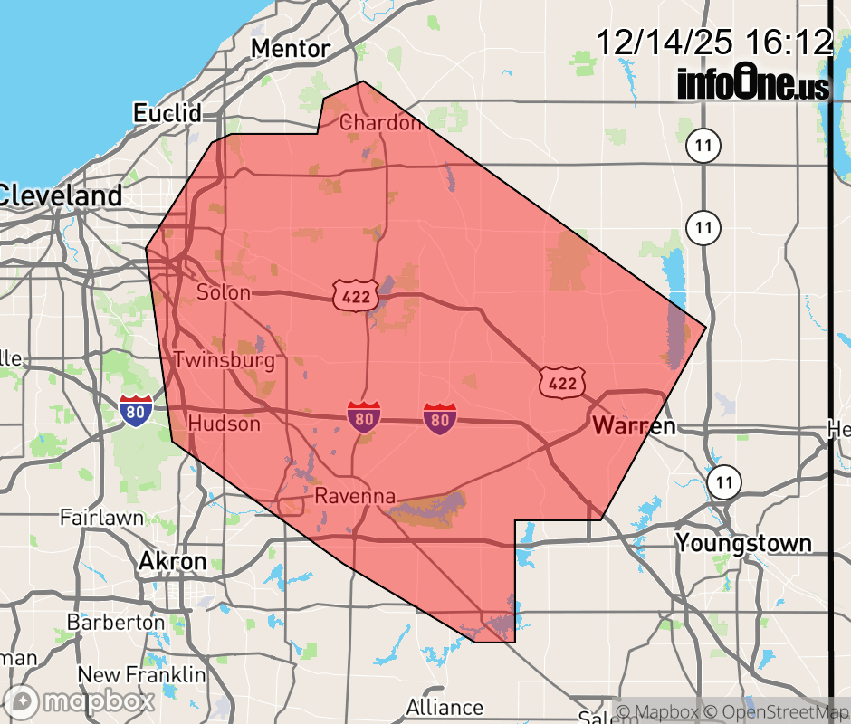 Canceled 12/14/25 5:30 PM Special Weather Statement issued December 14 at 4:10PM EST by NWS Cleveland OH At 409 PM EST, radar indicated an intense lake effect snow band along a line extending from Warrensville Heights to near Newton Falls, moving southeast at 10 mph. HAZARDS INCLUDE... Winds to 30 mph... Visibility rapidly dropping to less than a quarter of a mile... Snow rates of up to one inch per hour... Locations impacted include... Warren, Ravenna, Chardon, Kent, Solon, Hudson, Twinsburg, Streetsboro, Warrensville Heights, Macedonia, Cortland, Newton Falls, South Russell, Lordstown, Middlefield, Garrettsville, North Bloomfield, Burton, Highland Hills, and Mantua. Use extra caution if you must travel into or through this lake effect snow band. Rapid changes in visibility and potentially slick roads are likely to lead to accidents. Consider delaying travel until this snow band passes your location. ![]() |