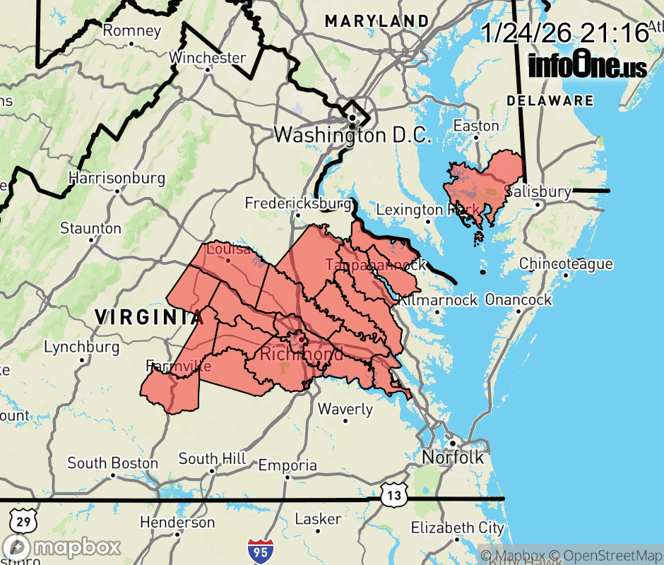 Canceled 1/25/26 2:06 AM Winter Storm Warning issued January 24 at 9:15PM EST until January 26 at 7:00PM EST by NWS Wakefield VA * WHAT... Heavy mixed precipitation. Snow and sleet will accumulate tonight and then change to freezing rain during the day Sunday. Total snow and sleet accumulations through Sunday morning between 4 and 8 inches. Ice accumulations up to one half of an inch Sunday into Sunday night. * WHERE... Portions of southeast Maryland and central, east central, north central, and southeast Virginia. * WHEN... Until 7 PM EST Monday. * IMPACTS... Power outages and tree damage are likely due to the ice. Travel could be nearly impossible. The hazardous conditions could impact the Monday morning and evening commutes. ![]() |