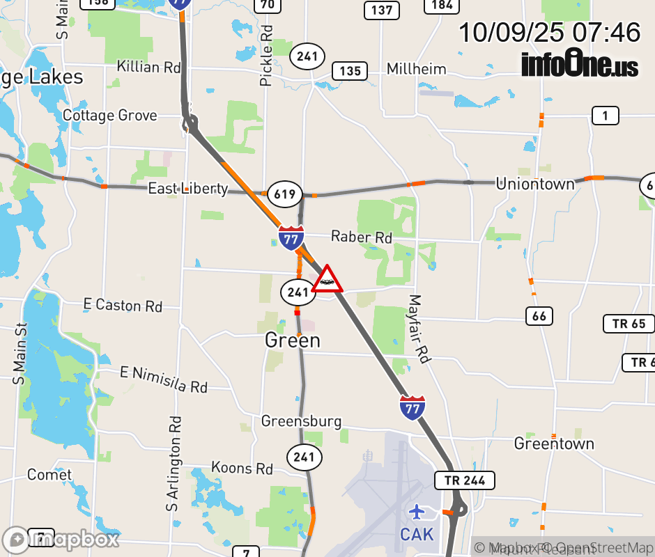 The left shoulder is blocked on I-77 North beyond Akron-Canton Airport, due to a crash. Updated: Thu 10/9/25 7:46 AM EDT ![]() Updated: Thu 10/9/25 7:46 AM EDT |