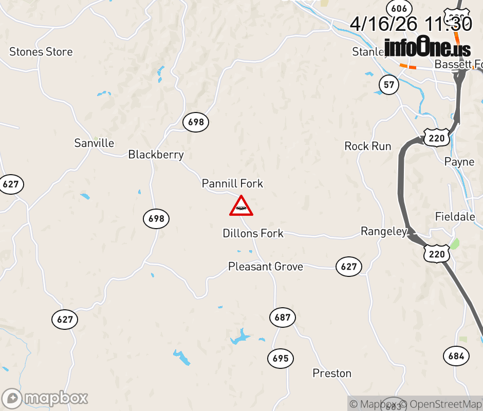 On Rt. 687 East in the County of Henry, in the vicinity of Valley Dr; Rt. 761E/W (Henry County), motorists can expect delays due to a vehicle crash. Lane closures exist. Updated: Thu 4/16/26 11:30 AM EDT ![]() Updated: Thu 4/16/26 11:30 AM EDT |