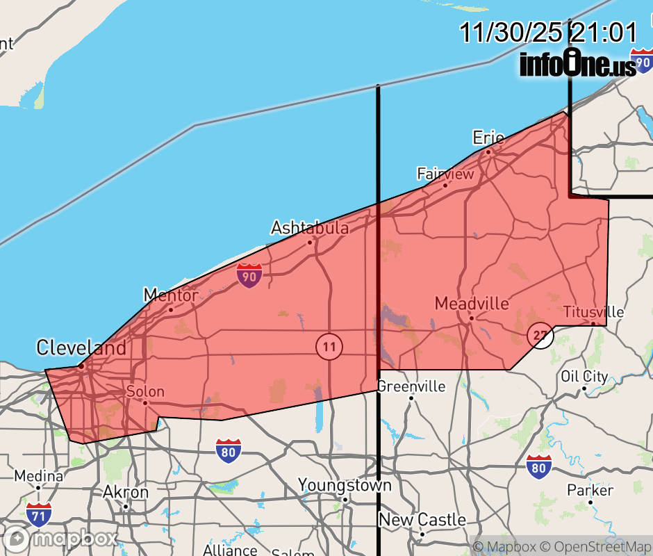 Canceled 11/30/25 10:15 PM Special Weather Statement issued November 30 at 9:00PM EST by NWS Cleveland OH At 859 PM EST, radar indicated an intense lake effect snow band along a line extending from 7 miles southeast of Northwest Harborcreek to Mentor, moving southeast at 15 mph. HAZARDS INCLUDE... Winds to 30 mph... Visibility rapidly dropping to less than a quarter of a mile... Up to 1 inches of quick snow accumulation... Locations impacted include... Cleveland, Erie, Painesville, Ashtabula, Willowick, Meadville, Conneaut, Chardon, Fairport Harbor, Geneva-On-The-Lake, Parma, Lakewood, Euclid, Mentor, Cleveland Heights, North Royalton, Solon, Willoughby, Twinsburg, and Eastlake. Use extra caution if you must travel into or through this lake effect snow band. Rapid changes in visibility and potentially slick roads are likely to lead to accidents. Consider delaying travel until this snow band passes your location. ![]() |