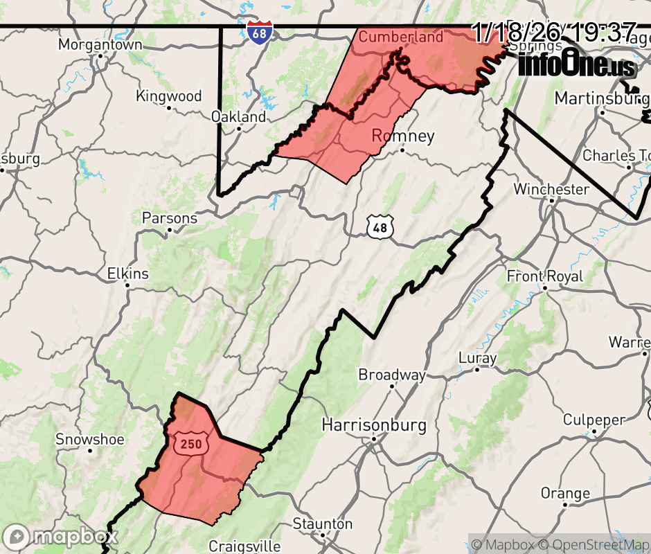 Canceled 1/19/26 1:44 AM Cold Weather Advisory issued January 18 at 7:35PM EST until January 20 at 1:00PM EST by NWS Baltimore MD/Washington DC * WHAT... Very cold wind chills between 10 and 20 below zero expected. * WHERE... In Maryland, Eastern Garrett, Extreme Western Allegany, and Western Garrett Counties. In Virginia, Western Highland County. In West Virginia, Western Mineral County. * WHEN... From 8 PM Monday to 1 PM EST Tuesday. * IMPACTS... The dangerously cold wind chills could cause frostbite on exposed skin in as little as 30 minutes. Wind chill values can lead to hypothermia with prolonged exposure. ![]() |