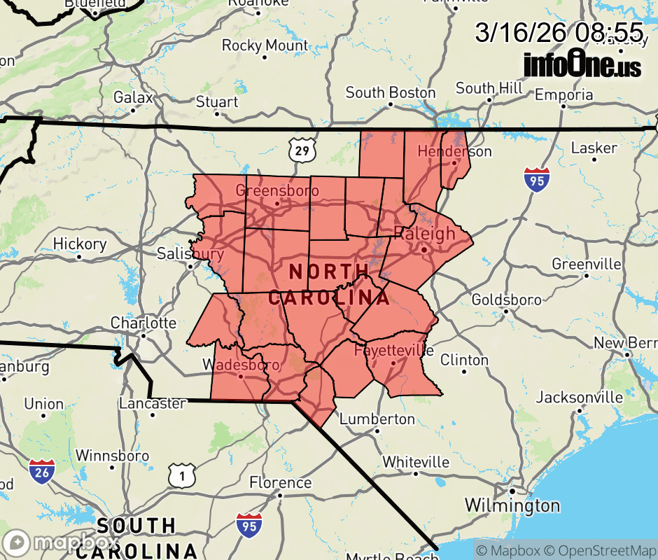 Canceled 3/16/26 11:34 AM Tornado Watch issued March 16 at 8:54AM EDT until March 16 at 2:00PM EDT by NWS Raleigh NC THE NATIONAL WEATHER SERVICE HAS ISSUED TORNADO WATCH 66 IN EFFECT UNTIL 2 PM EDT THIS AFTERNOON FOR THE FOLLOWING AREAS IN NORTH CAROLINA THIS WATCH INCLUDES 22 COUNTIES IN CENTRAL NORTH CAROLINA ALAMANCE ANSON CHATHAM CUMBERLAND DAVIDSON DURHAM FORSYTH GRANVILLE GUILFORD HARNETT HOKE LEE MONTGOMERY MOORE ORANGE PERSON RANDOLPH RICHMOND SCOTLAND STANLY VANCE WAKE THIS INCLUDES THE CITIES OF ABERDEEN, ALBEMARLE, ANGIER, APEX, ARCHDALE, ASHEBORO, BUIES CREEK, BURLINGTON, CAMP MACKALL, CARRBORO, CARTHAGE, CARY, CHAPEL HILL, CREEDMOOR, DUNN, DURHAM, ELLERBE, ERWIN, FAYETTEVILLE, GRAHAM, GREENSBORO, HENDERSON, HIGH POINT, HILLSBOROUGH, HOPE MILLS, KITTRELL, KNIGHTDALE, LAURINBURG, LEXINGTON, LILLINGTON, MEBANE, OXFORD, PINEHURST, PITTSBORO, POLKTON, RAEFORD, RALEIGH, ROCKINGHAM, ROUGEMONT, ROXBORO, SANFORD, SILER CITY, SOUTHERN PINES, SPRING LAKE, THOMASVILLE, TROY, WADESBORO, WAGRAM, WAKE FOREST, AND WINSTON-SALEM. ![]() |
