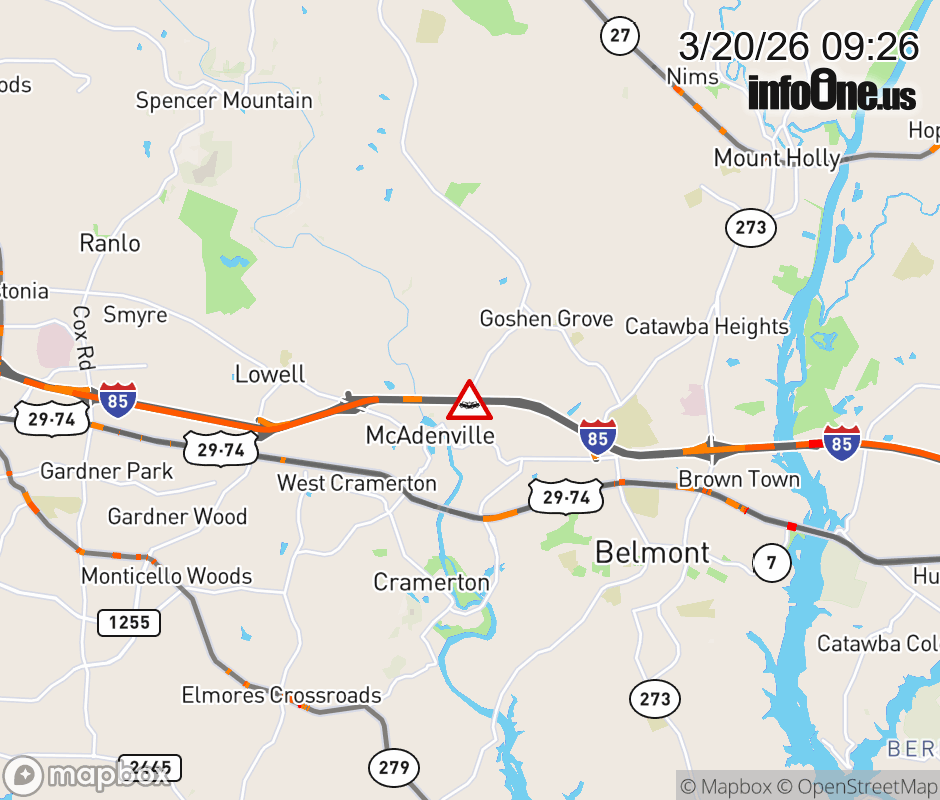 The left lane is closed prior to Exit 23 (McAdenville Rd.). ![]() |