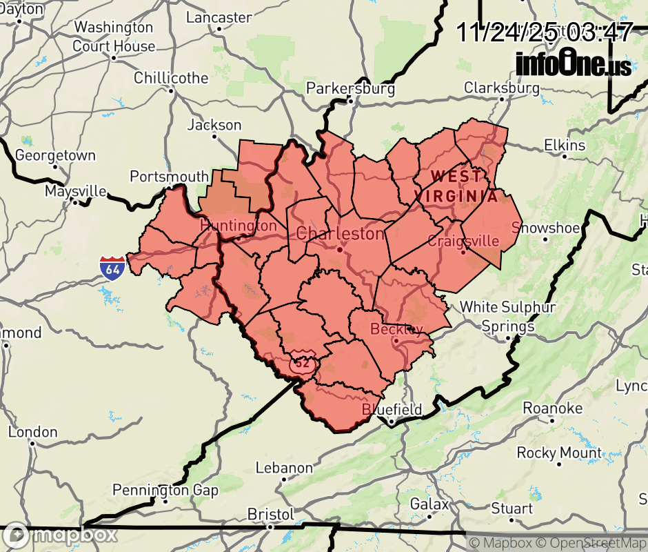 Canceled 11/24/25 5:21 AM Dense Fog Advisory issued November 24 at 3:46AM EST until November 24 at 10:00AM EST by NWS Charleston WV * WHAT... Visibility one quarter mile or less in dense fog. * WHERE... Portions of northeast Kentucky, southeast Ohio, and central, northern, southeast, southern, and western West Virginia. * WHEN... Until 10 AM EST this morning. * IMPACTS... Low visibility could make driving conditions hazardous. ![]() |