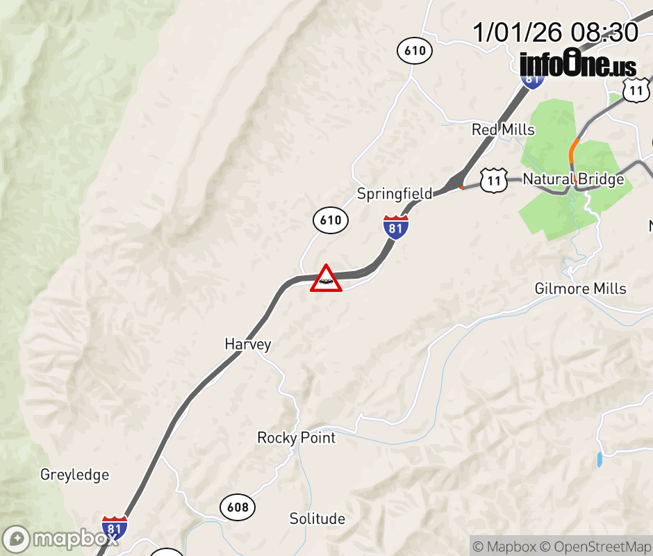 On I-81 at mile marker 173.6 in the County of Botetourt, motorists can expect delays due to a tractor trailer crash. The north right shoulder is closed. Updated: Thu 1/1/26 8:30 AM EST ![]() Updated: Thu 1/1/26 8:30 AM EST |