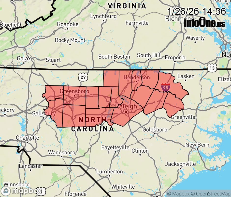 Canceled 1/27/26 7:00 AM Special Weather Statement issued January 26 at 2:35PM EST by NWS Raleigh NC Temperatures will quickly drop in to the 20s this evening and into the teens after midnight. With the arrival of darkness, the refreezing of residual moisture and slush on area roadways and walkways will result in slippery travel conditions. Icy spots may not be widespread but those traveling this evening through at least daybreak Tuesday should be on the lookout for rapidly changing conditions and patches of ice. Icy patches may be more common on bridges, shaded and sheltered locations where snow and sleet did not fully melt, and anywhere accumulatons of snow and ice were not removed or melted. ![]() |