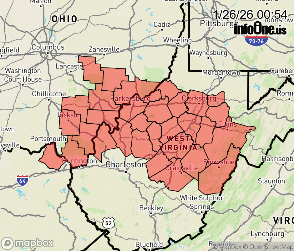 Canceled 1/26/26 11:00 AM Extreme Cold Warning issued January 26 at 12:52AM EST until January 27 at 12:00PM EST by NWS Charleston WV * WHAT... Dangerously cold wind chills as low as 17 below expected. * WHERE... Portions of northeast Kentucky, southeast Ohio, and central, northeast, northern, southeast, and western West Virginia. * WHEN... From 7 PM this evening to noon EST Tuesday. * IMPACTS... The cold wind chills as low as 17 below zero could result in hypothermia or frostbite if precautions are not taken. ![]() |