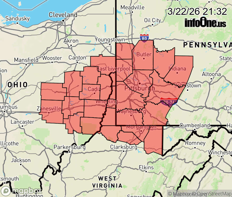 Canceled 3/22/26 10:31 PM Severe Thunderstorm Watch issued March 22 at 9:31PM EDT until March 23 at 12:00AM EDT by NWS Pittsburgh PA SEVERE THUNDERSTORM WATCH 72, PREVIOUSLY IN EFFECT UNTIL 10 PM EDT THIS EVENING, IS NOW IN EFFECT UNTIL MIDNIGHT EDT TONIGHT FOR THE FOLLOWING AREAS IN OHIO THIS WATCH INCLUDES 11 COUNTIES IN EAST CENTRAL OHIO BELMONT CARROLL COLUMBIANA COSHOCTON GUERNSEY HARRISON JEFFERSON OH MONROE MUSKINGUM NOBLE TUSCARAWAS IN PENNSYLVANIA THIS WATCH INCLUDES 10 COUNTIES IN SOUTHWEST PENNSYLVANIA ALLEGHENY FAYETTE GREENE WASHINGTON WESTMORELAND IN WEST CENTRAL PENNSYLVANIA ARMSTRONG BUTLER INDIANA IN WESTERN PENNSYLVANIA BEAVER LAWRENCE IN WEST VIRGINIA THIS WATCH INCLUDES 8 COUNTIES IN NORTHEAST WEST VIRGINIA PRESTON IN NORTHERN WEST VIRGINIA MARION MONONGALIA WETZEL IN THE NORTHERN PANHANDLE OF WEST VIRGINIA BROOKE HANCOCK MARSHALL OHIO THIS INCLUDES THE CITIES OF ALIQUIPPA, AMBRIDGE, BEAVER FALLS, BUTLER, CADIZ, CALDWELL, CAMBRIDGE, CANONSBURG, CARROLLTON, COLUMBIANA, CONNELLSVILLE, COSHOCTON, DOVER, EAST LIVERPOOL, ELLWOOD CITY, FAIRMONT, FOLLANSBEE, FORD CITY, GREENSBURG, INDIANA, KINGWOOD, KITTANNING, LATROBE, MARTINS FERRY, MASONTOWN, MONACA, MORGANTOWN, MOUNDSVILLE, MURRYSVILLE, NEW CASTLE, NEW KENSINGTON, NEW MARTINSVILLE, NEW PHILADELPHIA, PITTSBURGH METRO AREA, SALEM, ST. CLAIRSVILLE, STEUBENVILLE, TERRA ALTA, UNIONTOWN, WASHINGTON, WAYNESBURG, WEIRTON, WELLSBURG, WHEELING, WOODSFIELD, AND ZANESVILLE. ![]() |
