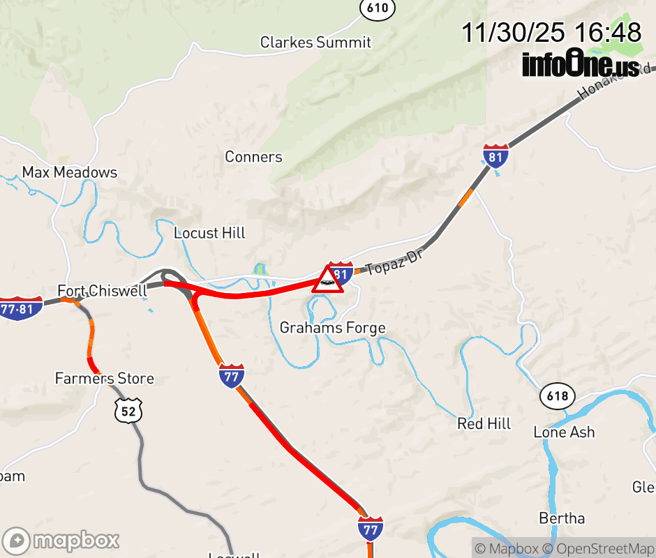 On I-81 at mile marker 83.8 in the County of Wythe, motorists can expect delays due to a vehicle crash. The north right shoulder is closed. Updated: Sun 11/30/25 4:48 PM EST ![]() Updated: Sun 11/30/25 4:48 PM EST |