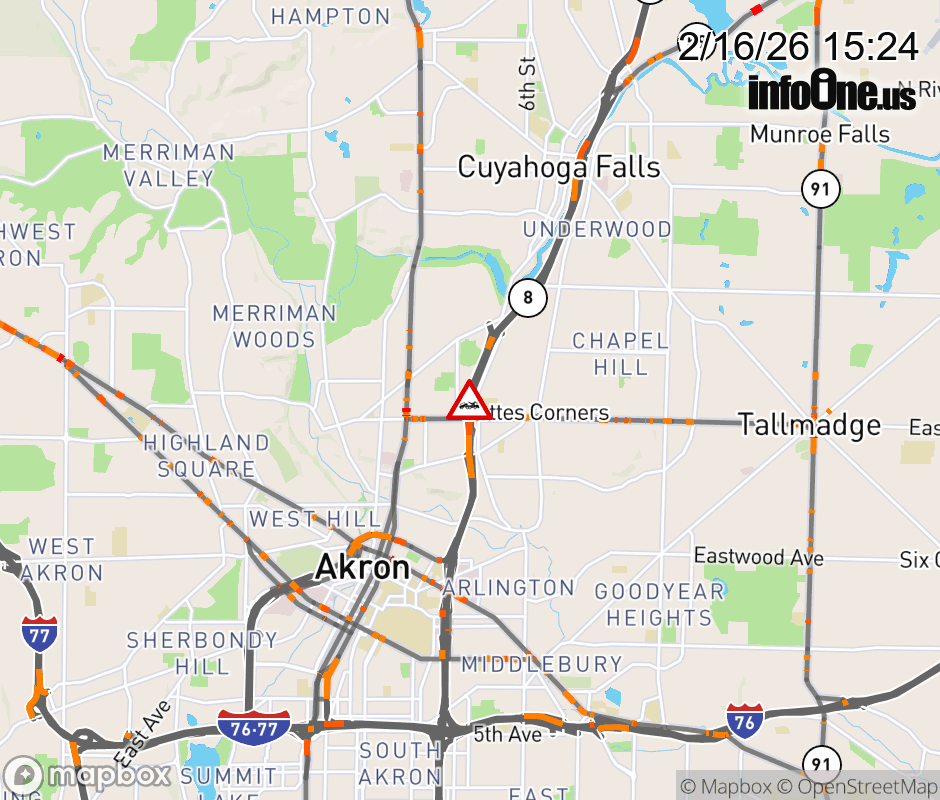 Ramp to SR-261/Tallmadge Ave from SR-8 South/SR-59 West is blocked due to disabled vehicle. Updated: Mon 2/16/26 3:24 PM EST ![]() Updated: Mon 2/16/26 3:24 PM EST |