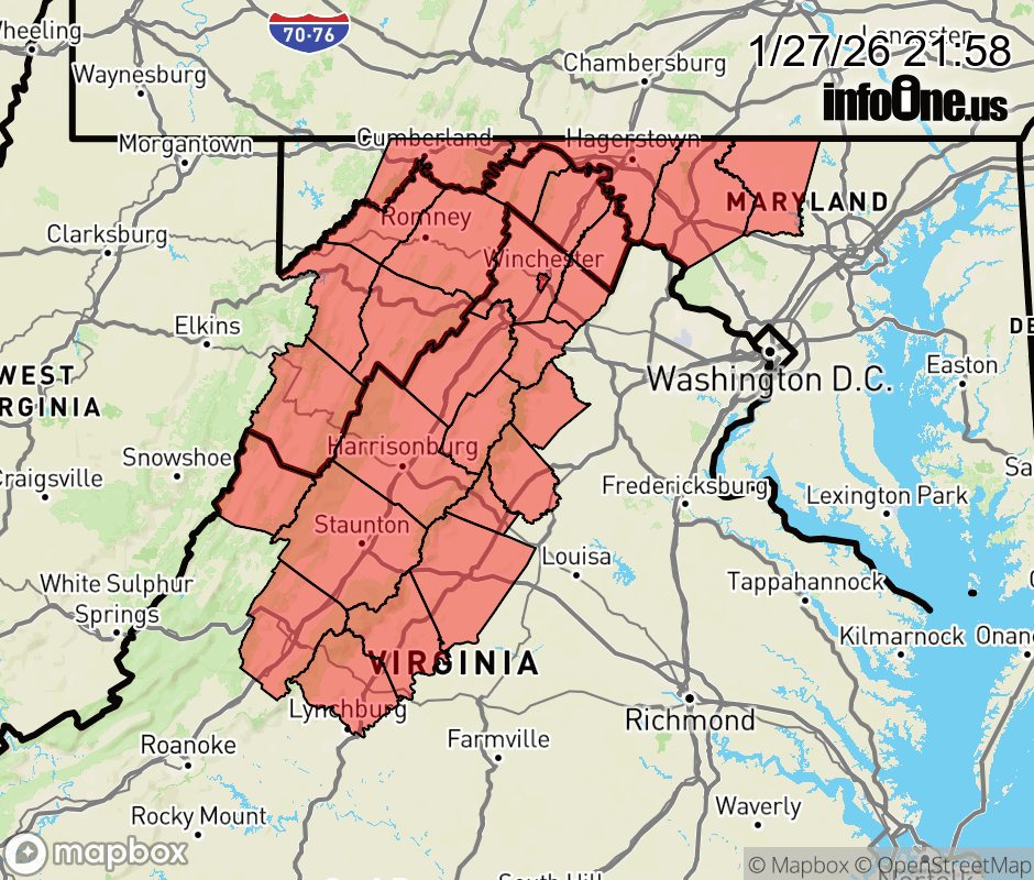 Canceled 1/27/26 11:41 PM Cold Weather Advisory issued January 27 at 9:57PM EST until January 28 at 11:00AM EST by NWS Baltimore MD/Washington DC * WHAT... Very cold wind chills as low as 12 below zero. * WHERE... Portions of north central and western Maryland, central, northwest, and western Virginia, and eastern and panhandle West Virginia. * WHEN... Until 11 AM EST Wednesday. * IMPACTS... The cold wind chills as low as 10 below zero could result in hypothermia if precautions are not taken. Frostbite will occur if unprotected skin is exposed to these temperatures. * ADDITIONAL DETAILS... Additional Cold Weather Headlines are expected at times through the end of the week as the region remains in an Arctic airmass. ![]() |