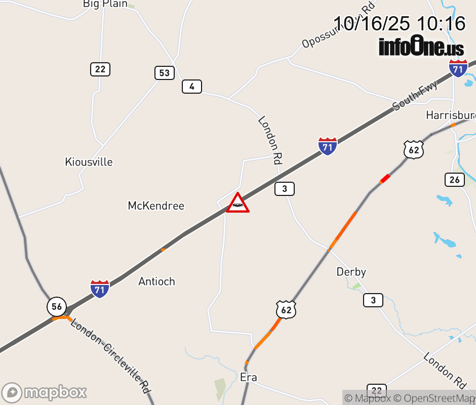Expect lane closures on I-71 North beyond SR-56/London/Mt Sterling, due to a crash. ![]() |