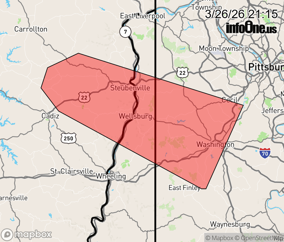 Canceled 3/26/26 9:28 PM Severe Thunderstorm Warning issued March 26 at 9:13PM EDT until March 26 at 10:00PM EDT by NWS Pittsburgh PA At 913 PM EDT, a severe thunderstorm was located 9 miles west of Wintersville, or 11 miles northeast of Cadiz, moving east at 55 mph. HAZARD...Ping pong ball size hail and 60 mph wind gusts. SOURCE...Radar indicated. IMPACT...People and animals outdoors will be injured. Expect hail damage to roofs, siding, windows, and vehicles. Expect wind damage to roofs, siding, and trees. Locations impacted include... Weirton, Steubenville, Washington, Canonsburg, Wellsburg, West Liberty, Avella, Cecil-Bishop, Wintersville, Mingo Junction, Follansbee, Wolfdale, McGovern, Hooverson Heights, East Washington, Burgettstown, Houston, Bethany and Hopedale. ![]() |