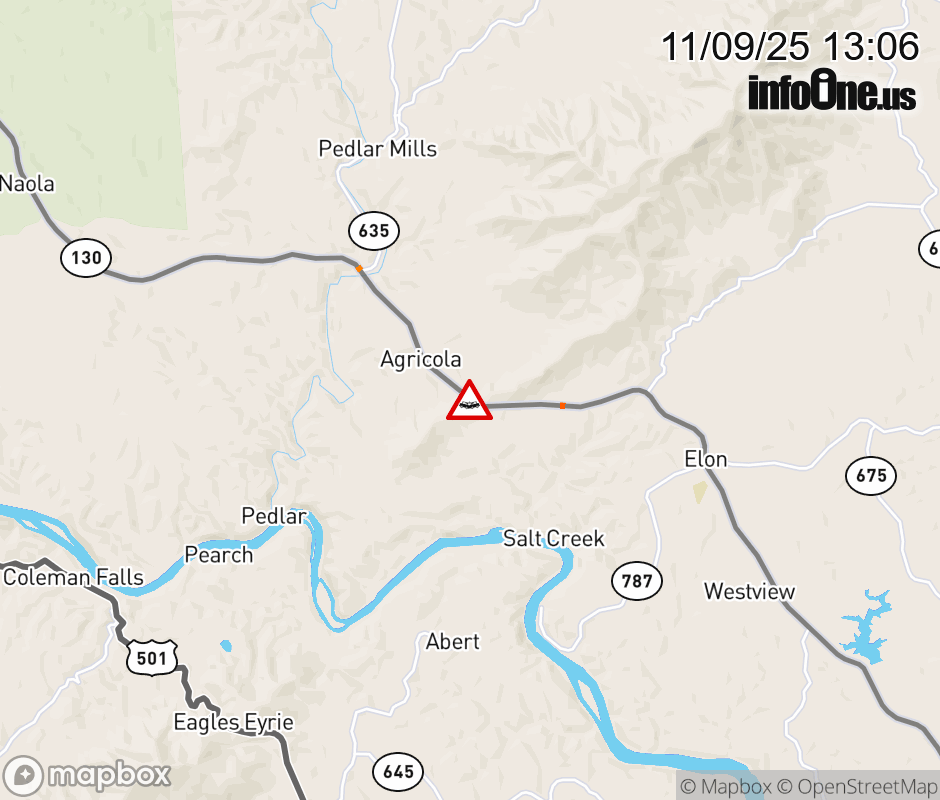 On VA-130 in the County of Amherst, in the vicinity of Crane Dr; Mountain Crest Ln, motorists can expect delays due to a vehicle crash. All east lanes are closed. All west lanes are closed. ![]() |