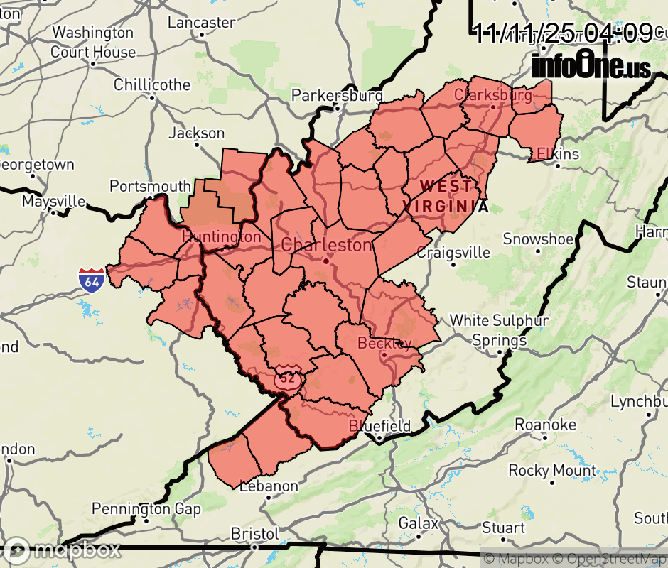 Canceled 11/11/25 6:57 AM Winter Weather Advisory issued November 11 at 4:08AM EST until November 11 at 7:00AM EST by NWS Charleston WV * WHAT... Snow. Additional snow accumulations up to one inch. * WHERE... Portions of northeast Kentucky, southeast Ohio, southwest Virginia, and central, northern, southeast, southern, and western West Virginia. * WHEN... Until 7 AM EST this morning. * IMPACTS... Plan on slippery road conditions. The hazardous conditions could impact the Tuesday morning commute. ![]() |