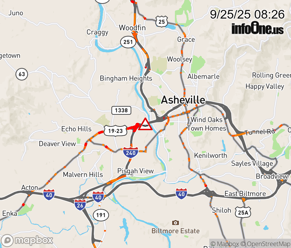 The left shoulder is closed just past Exit 3-A, US 19/23/74 Alt (Patton Avenue) due to a crash. Updated: Thu 9/25/25 8:26 AM EDT ![]() Updated: Thu 9/25/25 8:26 AM EDT |