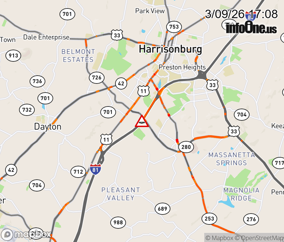 On I-81 at mile marker 245 in the County of Rockingham, motorists can expect delays due to a tractor trailer crash. The south left shoulder and right shoulder are closed. Updated: Mon 3/9/26 5:08 PM EDT ![]() Updated: Mon 3/9/26 5:08 PM EDT |