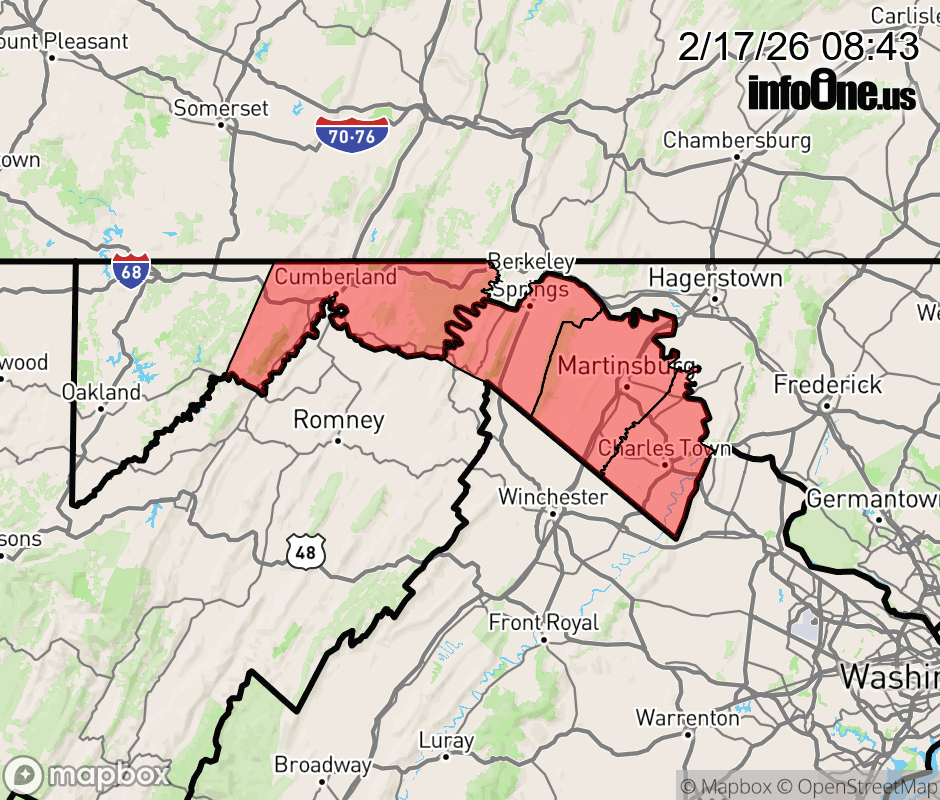 Canceled 2/17/26 10:00 AM Freezing Fog Advisory issued February 17 at 8:41AM EST until February 17 at 10:00AM EST by NWS Baltimore MD/Washington DC * WHAT... Visibility less than one quarter of a mile in freezing fog. * WHERE... In Maryland, Central and Eastern Allegany County. In West Virginia, Berkeley, Jefferson, and Morgan Counties. * WHEN... Until 10 AM EST this morning. * IMPACTS... Low visibility could make driving conditions hazardous. ![]() |