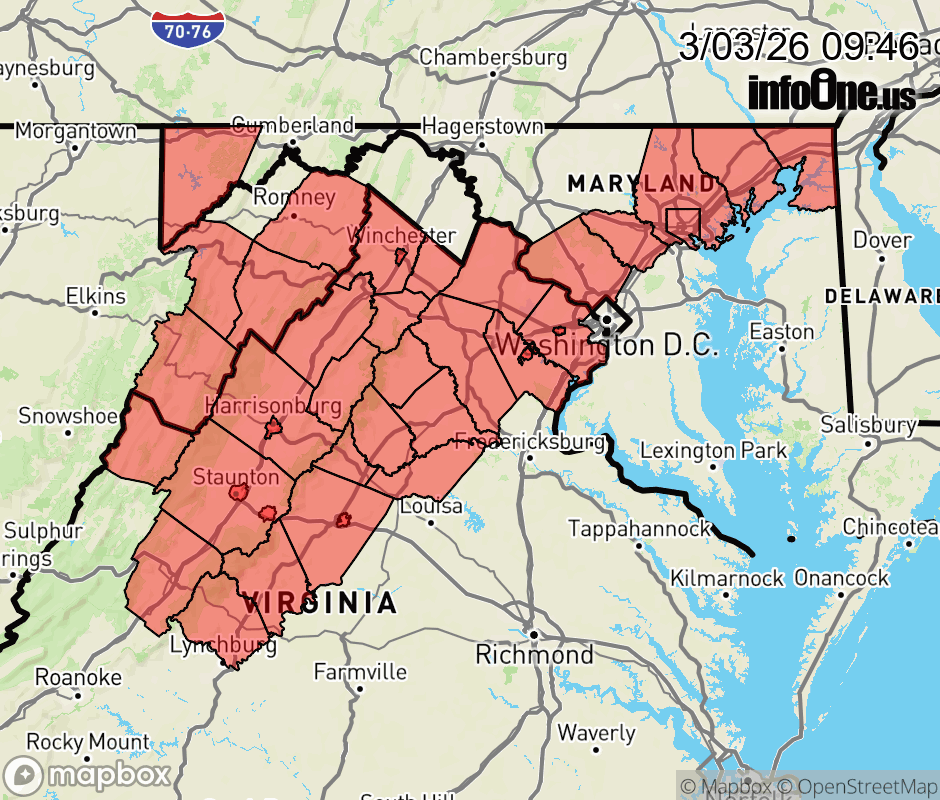 Canceled 3/3/26 10:00 AM Winter Weather Advisory issued March 3 at 9:45AM EST until March 3 at 10:00AM EST by NWS Baltimore MD/Washington DC Temperatures are around 33 to 36 degrees so any icy spots will be restricted to the colder elevated surfaces like overpasses and bridges. ![]() |