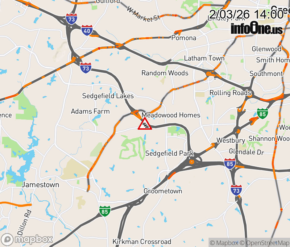The right lane is closed 1 mile before Exit 100 (W Gate City Blvd). Updated: Tue 2/3/26 2:00 PM EST ![]() Updated: Tue 2/3/26 2:00 PM EST |