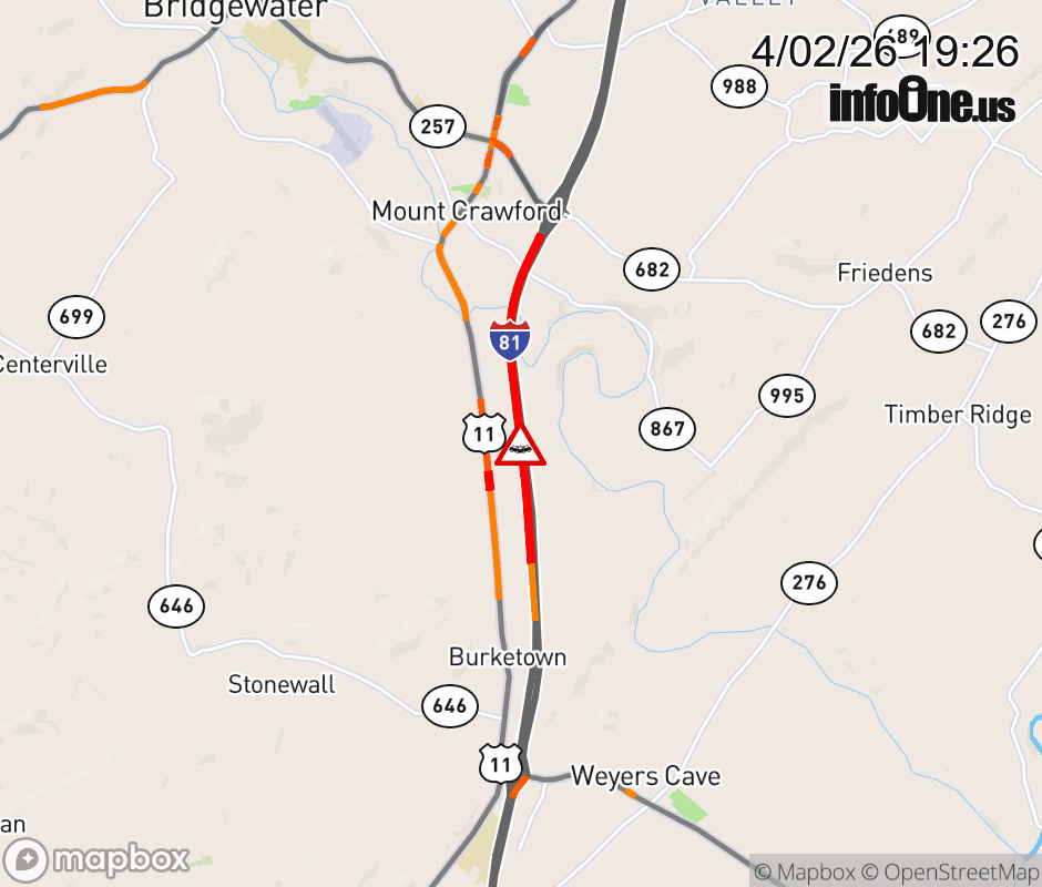 On I-81 South at mile marker 238 in the County of Rockingham, motorists can expect delays due to a vehicle crash. Traffic backups are approximately 2.0 miles. Updated: Thu 4/2/26 7:26 PM EDT ![]() Updated: Thu 4/2/26 7:26 PM EDT |