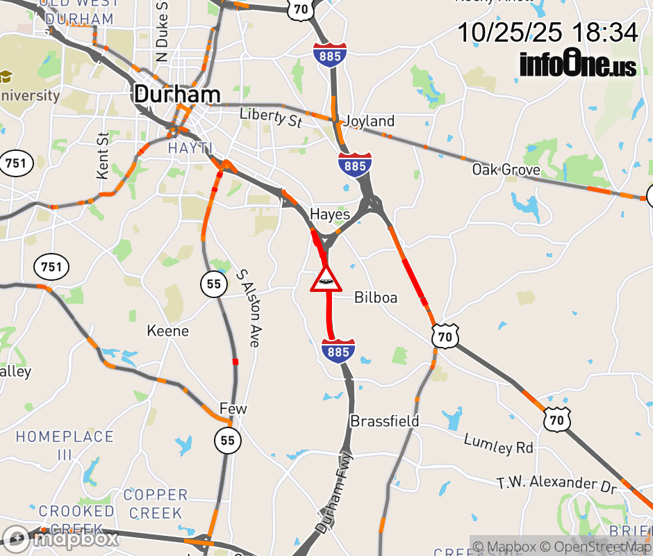 The right shoulder is closed near Exit 9 (NC-147). Updated: Sat 10/25/25 6:34 PM EDT ![]() Updated: Sat 10/25/25 6:34 PM EDT |
