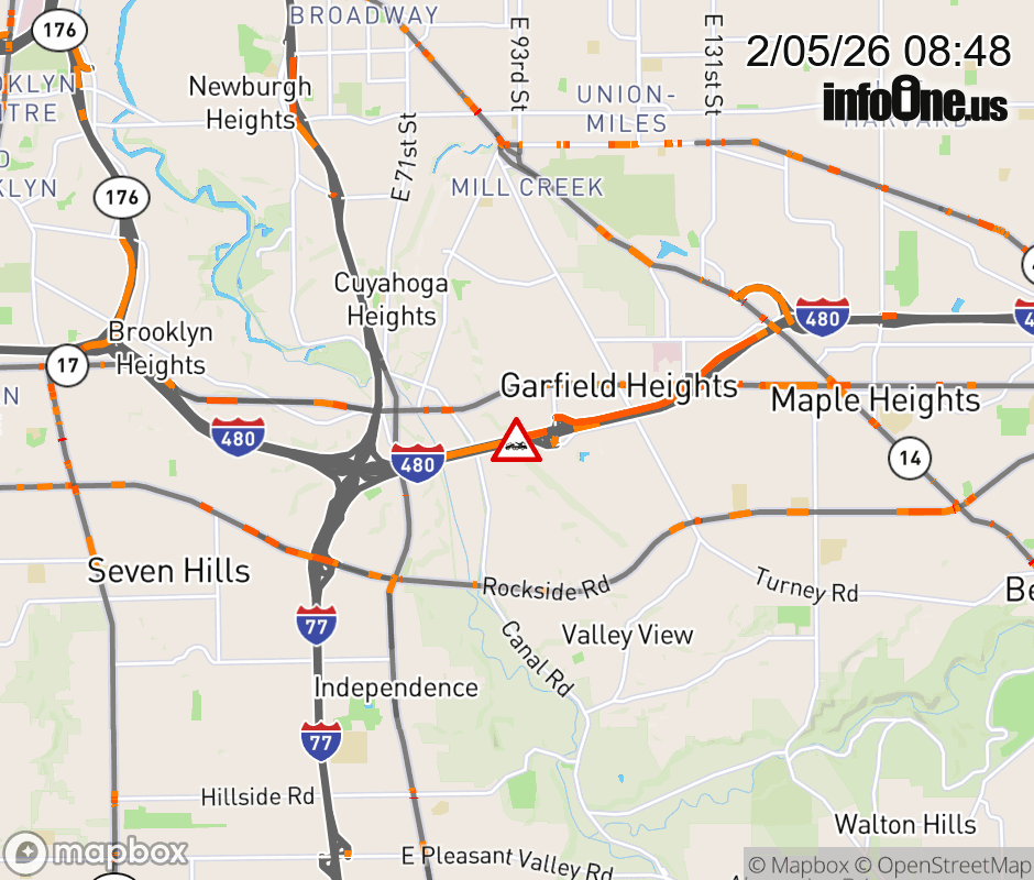 The left lane is blocked on I-480 West Express at Transportation Blvd/E 98th St, due to a disabled vehicle. Updated: Thu 2/5/26 8:48 AM EST ![]() Updated: Thu 2/5/26 8:48 AM EST |