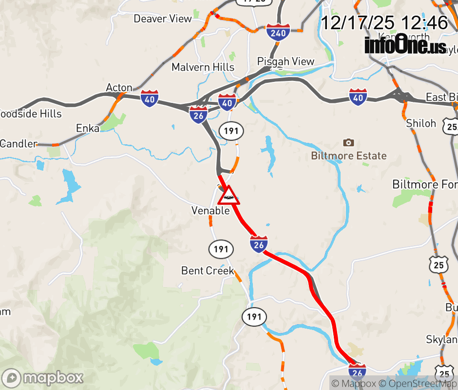 The right shoulder is closed prior to Exit 33, NC 191 (Brevard Road) due to a crash. Updated: Wed 12/17/25 12:46 PM EST ![]() Updated: Wed 12/17/25 12:46 PM EST |