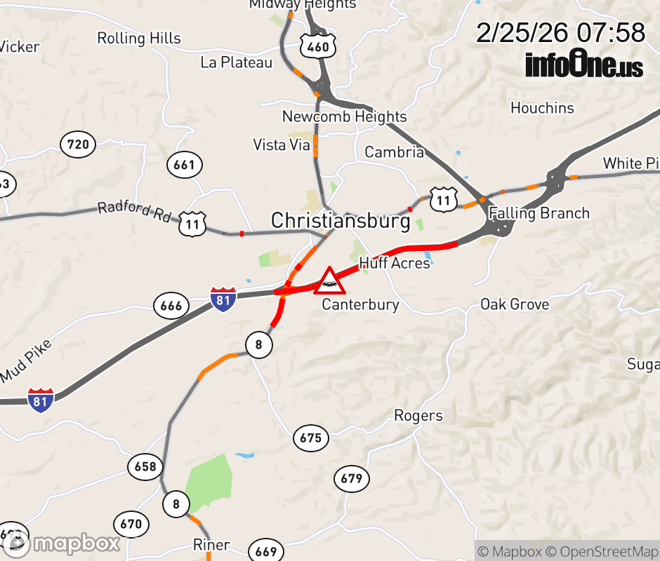 On I-81 at mile marker 115 in the County of Montgomery, motorists can expect delays due to a vehicle crash. The north left shoulder and left lane are closed. Updated: Wed 2/25/26 7:58 AM EST ![]() Updated: Wed 2/25/26 7:58 AM EST |