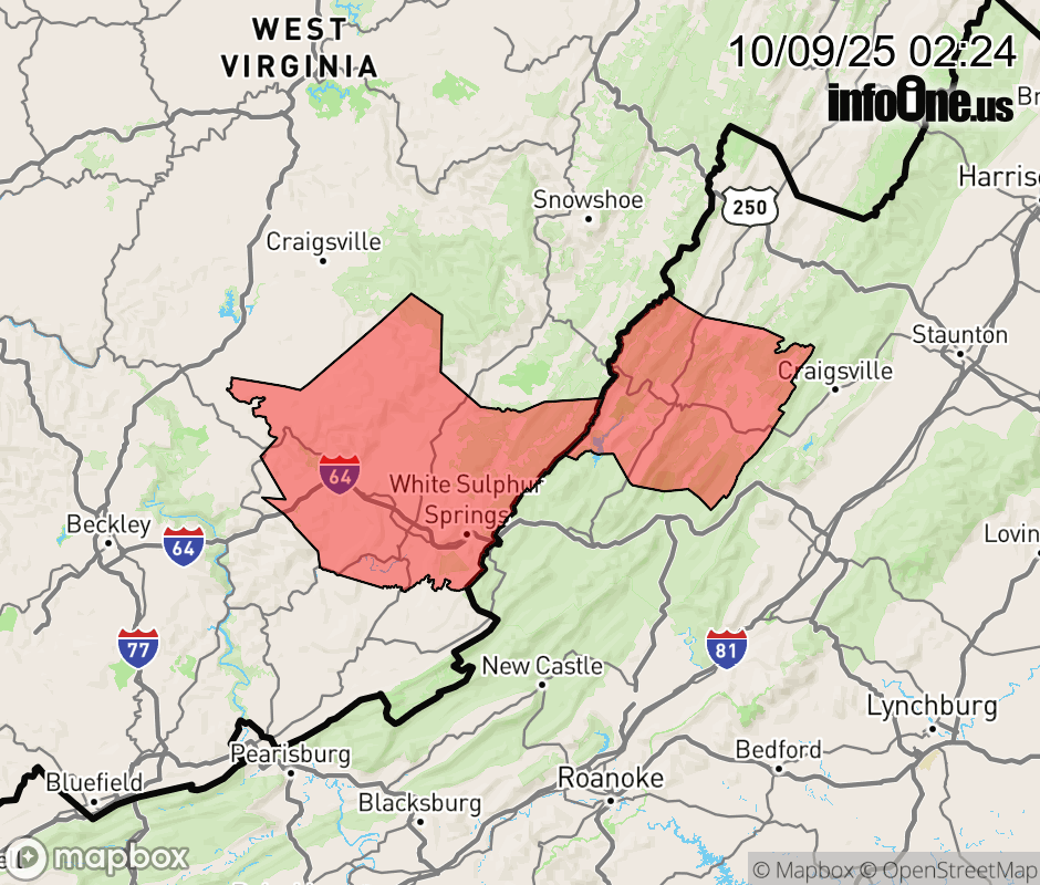 Canceled 10/9/25 8:41 AM Frost Advisory issued October 9 at 2:22AM EDT until October 9 at 9:00AM EDT by NWS Blacksburg VA * WHAT... For the Frost Advisory, temperatures as low as 33 will result in frost formation. For the Freeze Watch, sub-freezing temperatures as low as 29 possible. * WHERE... In Virginia, Bath County. In West Virginia, Eastern Greenbrier and Western Greenbrier Counties. * WHEN... For the Frost Advisory, until 9 AM EDT this morning. For the Freeze Watch, from late tonight through Friday morning. * IMPACTS... Frost and freeze conditions could kill crops, other sensitive vegetation and possibly damage unprotected outdoor plumbing. Frost could harm sensitive outdoor vegetation. Sensitive outdoor plants may be killed if left uncovered. ![]() |