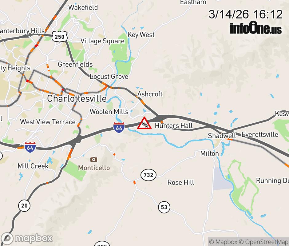 On I-64 at mile marker 124 in the County of Albemarle, motorists can expect delays due to a brush fire. The east left shoulder and left lane are closed. ![]() |