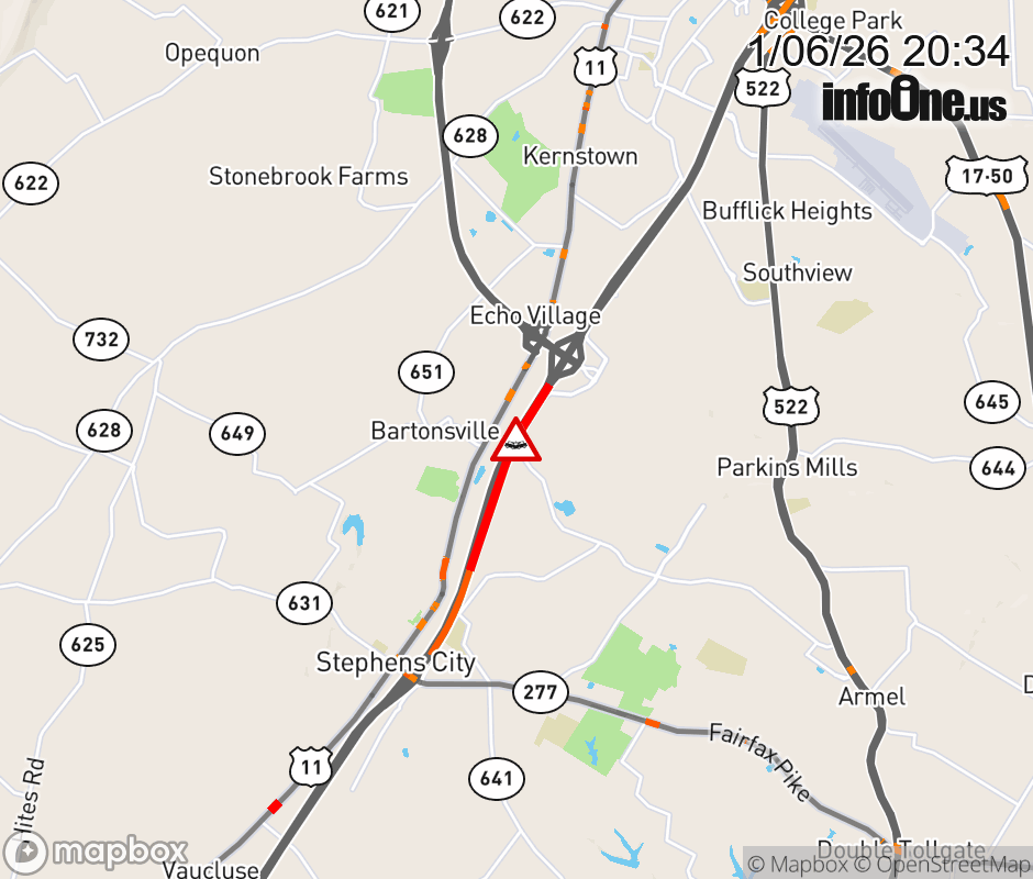 On I-81 North at mile marker 309.3 in the County of Frederick, motorists can expect delays due to a multi-vehicle crash. Traffic backups are approximately 2.0 miles. Updated: Tue 1/6/26 8:34 PM EST ![]() Updated: Tue 1/6/26 8:34 PM EST |