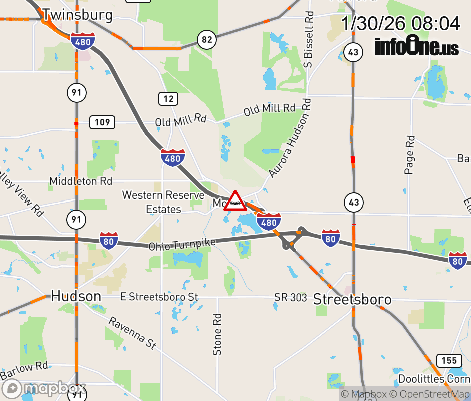 Expect lane closures on I-480/SR-14 West beyond Aurora Hudson Rd/Frost Rd, due to a crash. Updated: Fri 1/30/26 8:04 AM EST ![]() Updated: Fri 1/30/26 8:04 AM EST |