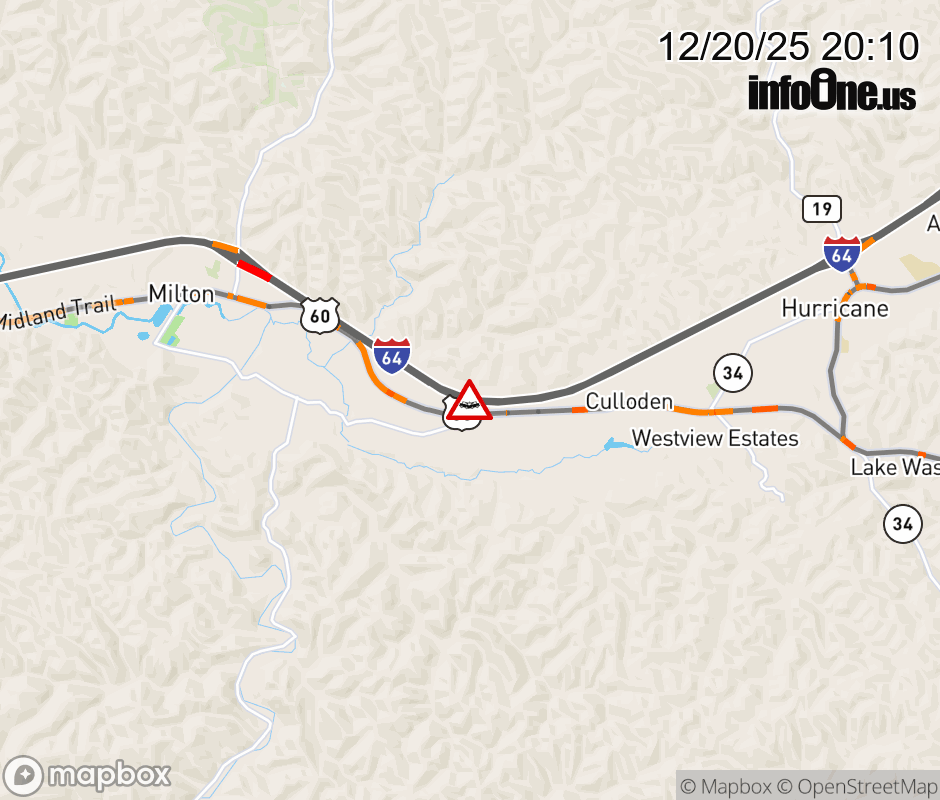 Vehicle Crash on I-64E at Mile Marker 30.0. The eastbound road is closed. Updated: Sat 12/20/25 8:10 PM EST ![]() Updated: Sat 12/20/25 8:10 PM EST |