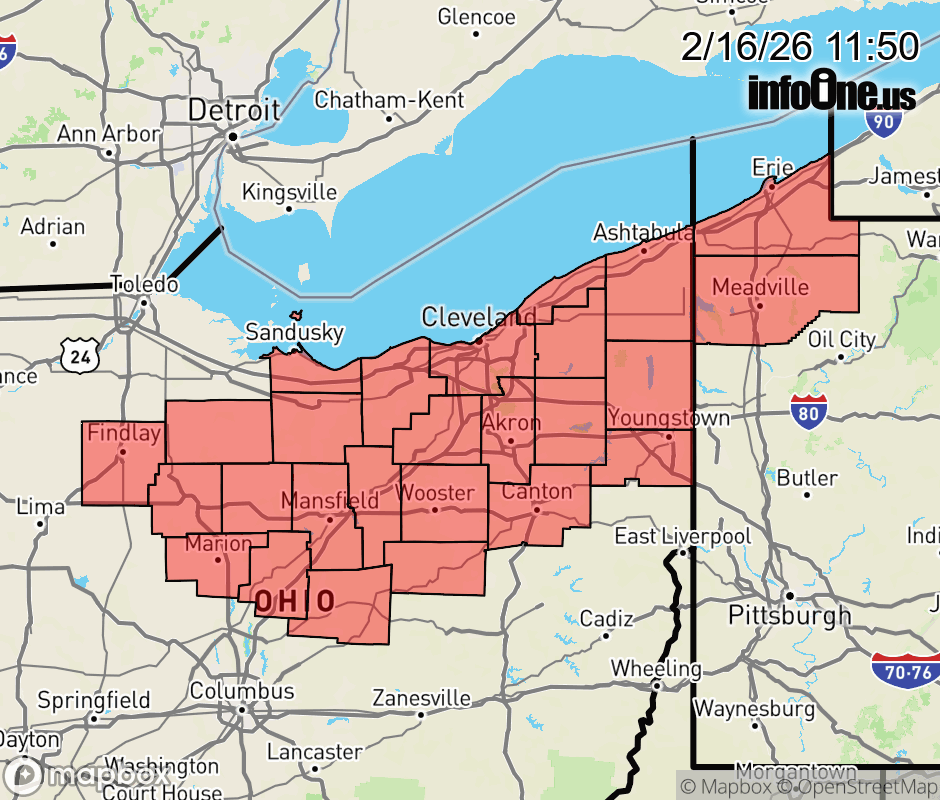 Canceled 2/16/26 12:00 PM Dense Fog Advisory issued February 16 at 11:49AM EST until February 16 at 12:00PM EST by NWS Cleveland OH Visibilities continue to improve across the area this morning, allowing for the Dense Fog Advisory to expire. There is still a chance of patchy dense fog, especially along a line extending from Marion Ohio northeast toward Meadville Pennsylvania, into early this afternoon. ![]() |