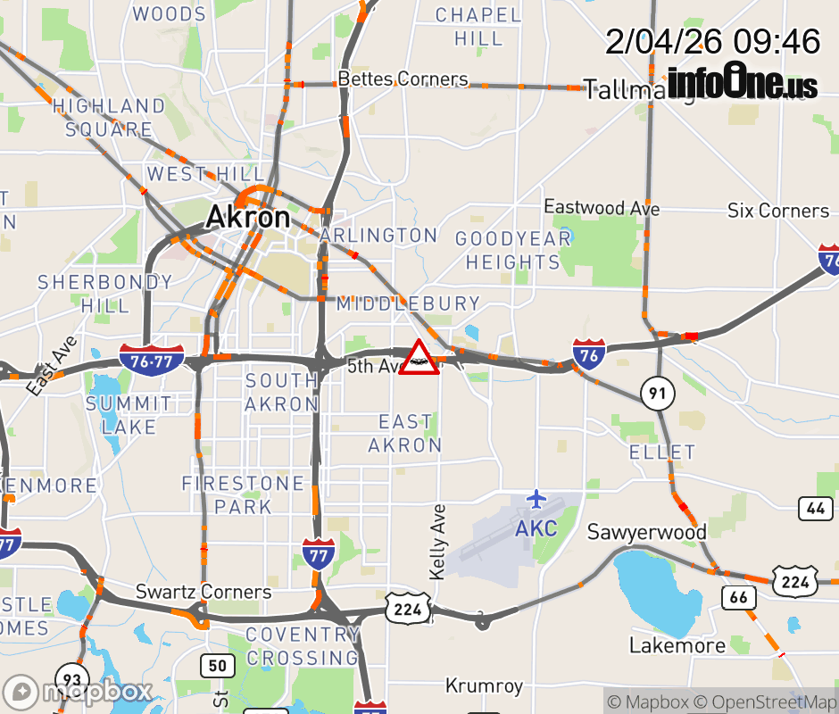 The 2 right lanes are blocked on I-76 East beyond Arlington St/Kelly Ave, due to a crash. Updated: Wed 2/4/26 9:46 AM EST ![]() Updated: Wed 2/4/26 9:46 AM EST |