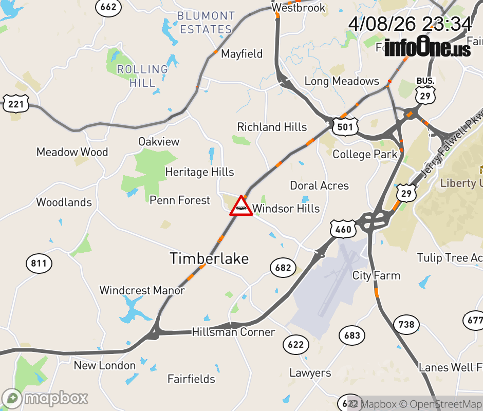 On BUS US-460 in the County of Campbell, in the vicinity of Rt. 739E/W (Campbell County), motorists can expect delays due to a vehicle crash. The east right lane and right shoulder are closed. Updated: Wed 4/8/26 11:34 PM EDT ![]() Updated: Wed 4/8/26 11:34 PM EDT |