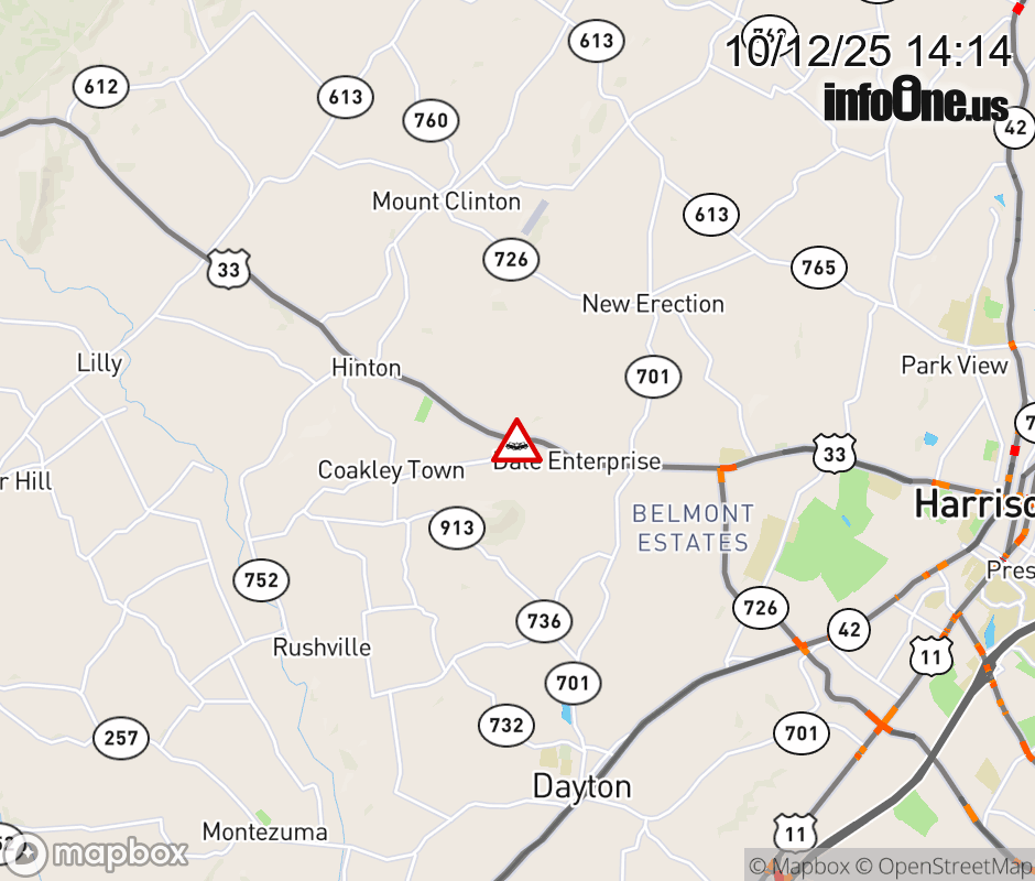 On US-33 in the County of Rockingham, in the vicinity of Bank Church Rd; Rt. 734N/S (Rockingham County), motorists can expect delays due to a vehicle crash. All west lanes are closed. ![]() |