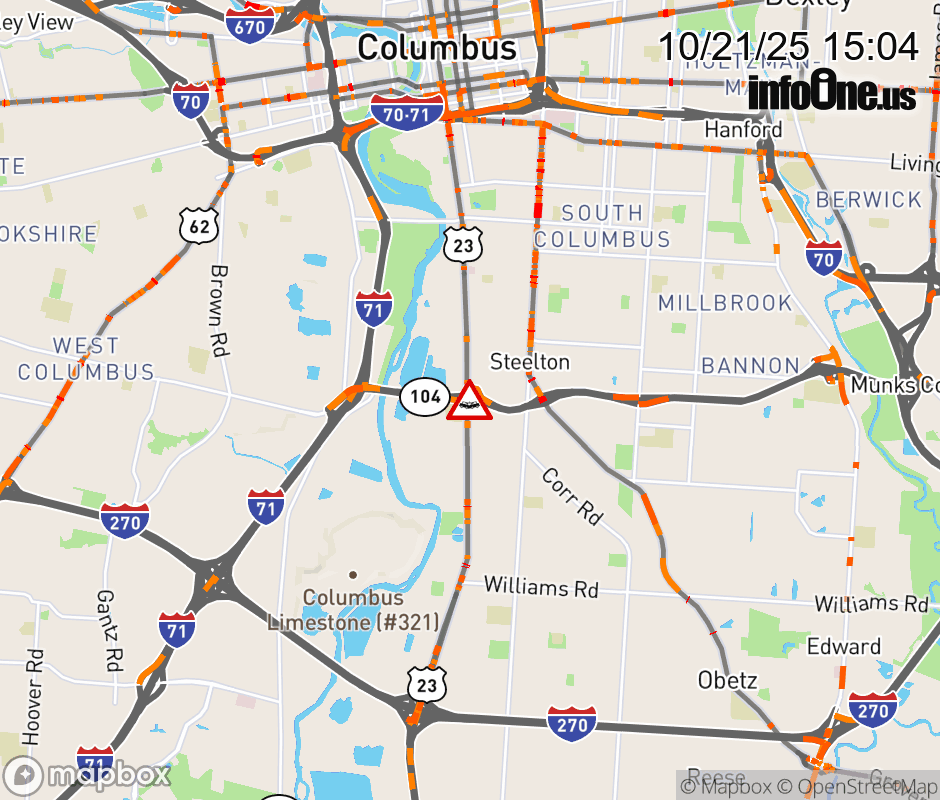 The left lane is blocked on SR-104 East beyond US-23/High St, due to a crash. Updated: Tue 10/21/25 3:04 PM EDT ![]() Updated: Tue 10/21/25 3:04 PM EDT |