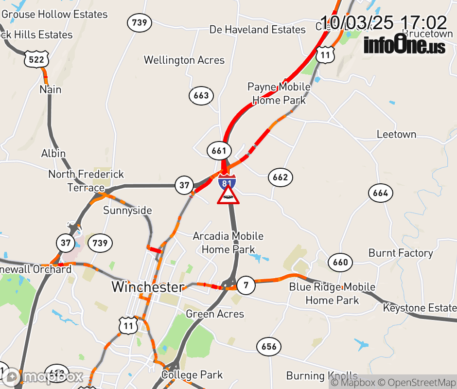 On I-81 South at mile marker 317.3 in the County of Frederick, motorists can expect delays due to a vehicle crash. Traffic backups are approximately 5.0 miles. Updated: Fri 10/3/25 5:02 PM EDT ![]() Updated: Fri 10/3/25 5:02 PM EDT |
